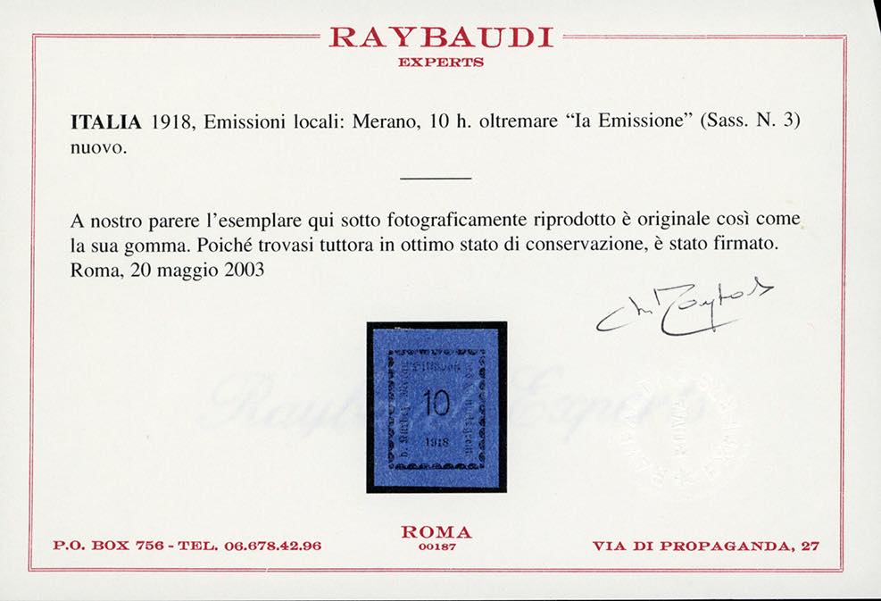 MERANO 1918 - 10 h. oltremare (3), nuovo, gomma originale, perfetto. Cert. Raybaudi.