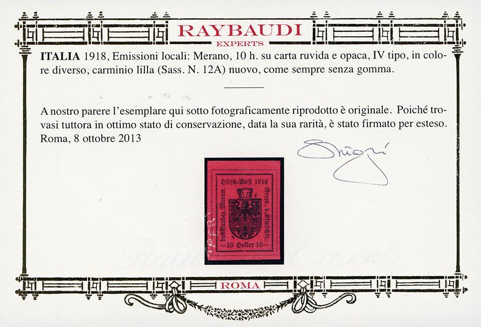 MERANO 1918 - 10 h. carminio lilla, IV tipo, errore di colore (12/A), nuovo, senza gomma come sempre, perfetto. Raro e molto fresco. Cert. Oro Raybaudi.