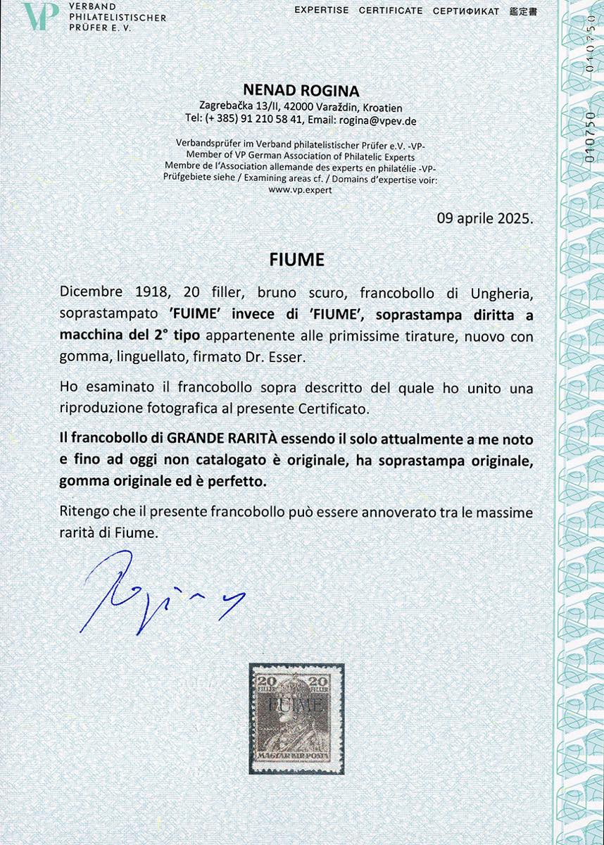FIUME 1918 - 20 f. bruno, soprastampa a macchina, ERRORE DI SOPRASTAMPA "FUIME" anziché "FIUME" (25), nuovo, gomma originale, perfetto. Varietà eccezionale appartenente alle primissime tirature, non catalogata. Si tratta dell'UNICO ESEMPLARE NOTO, da annoverarsi tra le massime rarità di Fiume. Cert. Rogina.