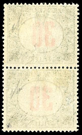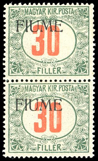 FIUME SEGNATASSE 1918/19 - 30 f. cifre rosse, soprastampa a macchina fortemente spostata a sinistra (12caf), coppia verticale, gomma originale integra, perfetta. Rara. G.Oliva, cert. Avi.
