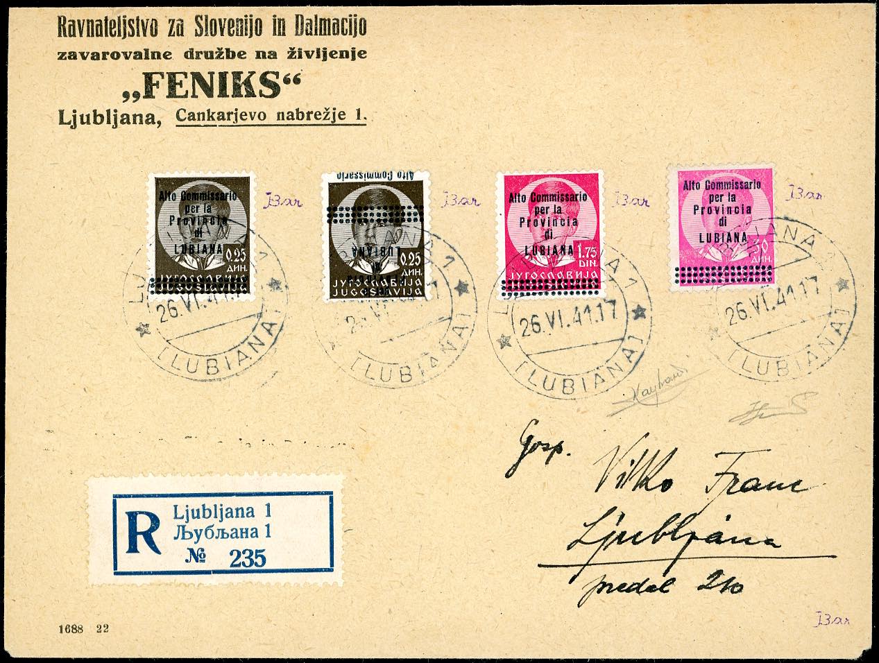 LUBIANA 1941 - Non emessi, 25 p., due esemplari, uno con soprastampa capovolta, 1,75 d., 30 d. (61,61a,63,68), perfetti, su busta ... Leggi tutto