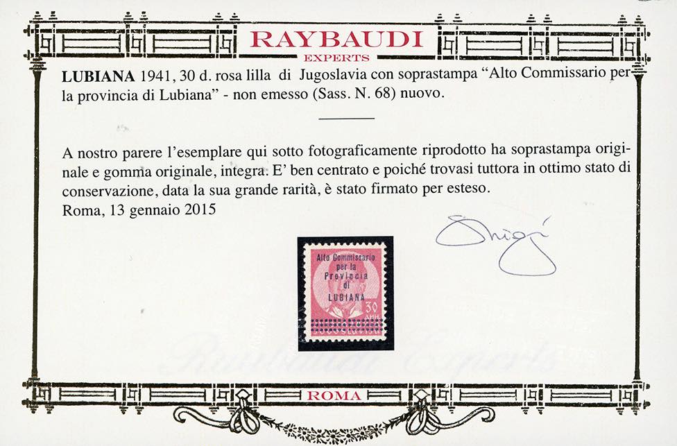 LUBIANA 1941 - 30 d. soprastampato "Alto Commissario per la Provincia di Lubiana", non emesso (68), nuovo, gomma originale integra, perfetto e di ottima qualità. Estremamente raro, solo 17 esemplari noti. A.Diena, cert. E.Diena e Oro Raybaudi.