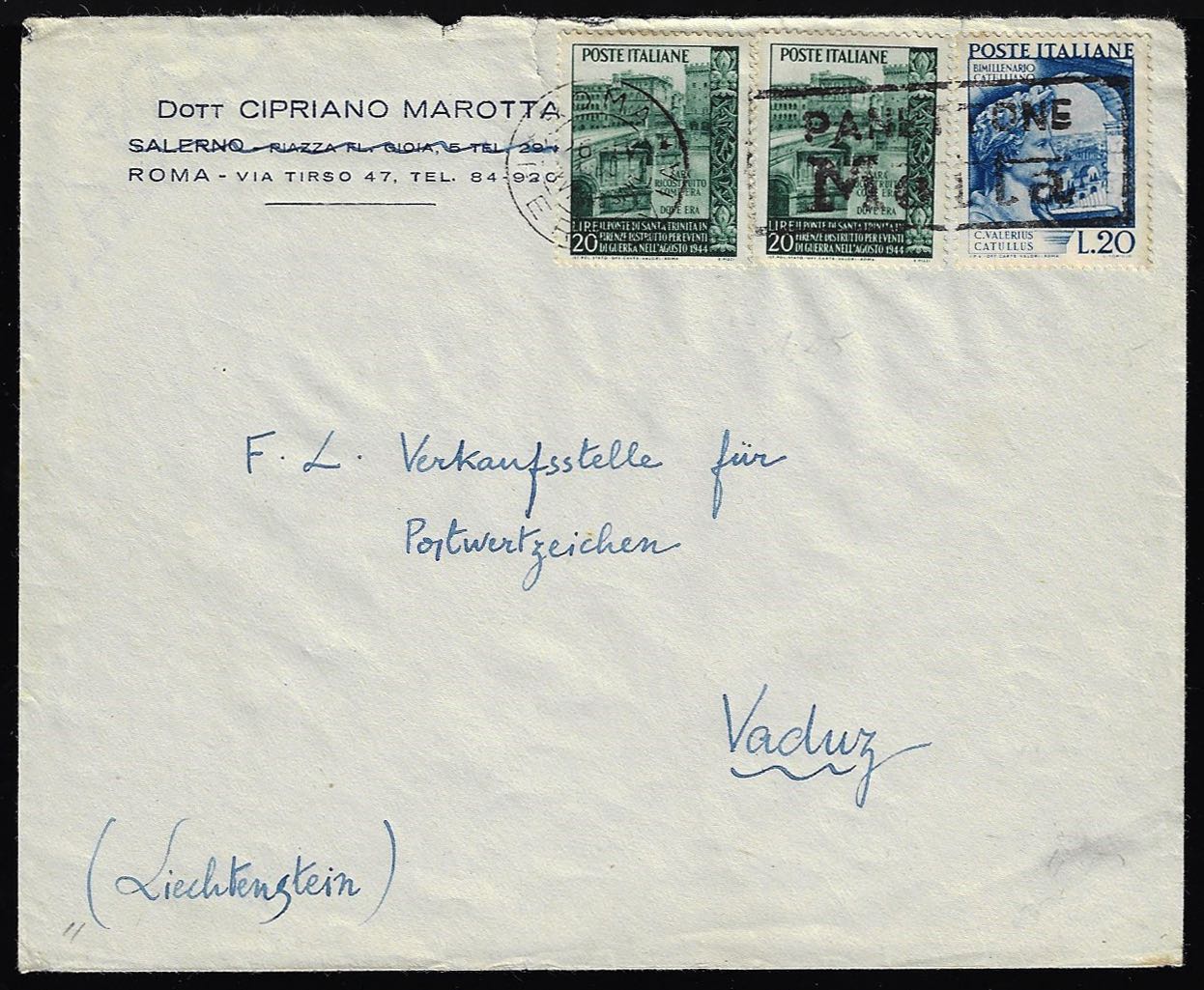 1950 - 20 lire Ponte Trinità, due esemplari, 20 lire Catullo (613/614), perfetti, su busta da Roma 26/2/1950 a Vaduz, Liechtenstein. Bella ... Leggi tutto