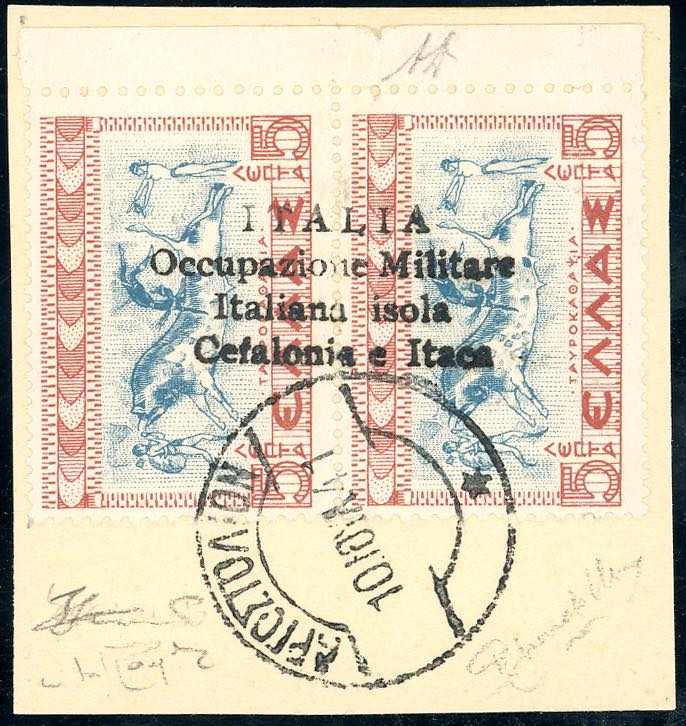 CEFALONIA E ITACA - EMISSIONI DI ARGOSTOLI 1941 - 5 l. + 5 l. Mitologica, soprastampa a mano verticale su coppia verticale (56b), perfetta, usata su piccolo frammento. Raybaudi, Mondolfo, A.Diena, cert. Ferrario.