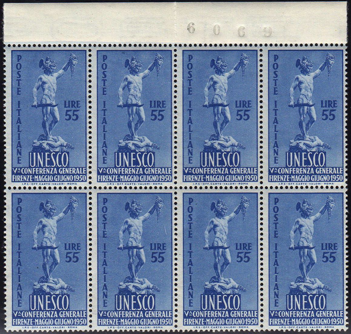 1950 - 55 lire Unesco (619), blocco di otto, gomma integra, perfetto.