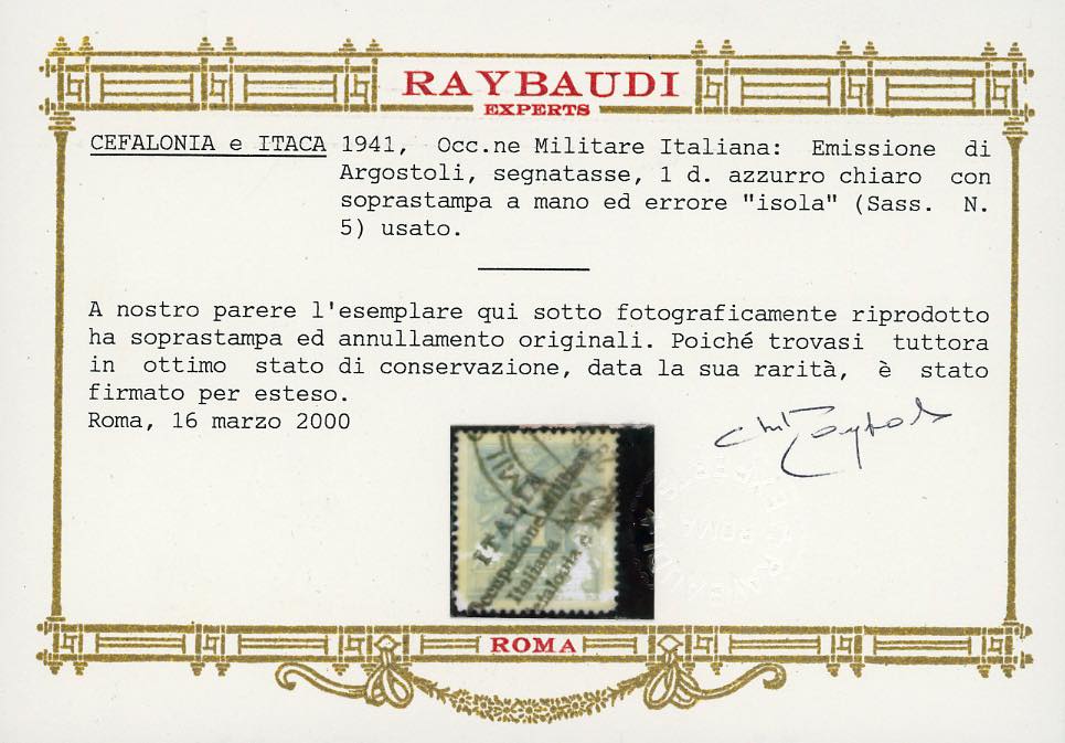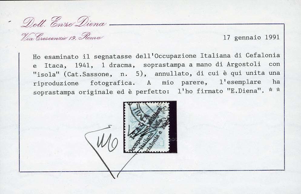 CEFALONIA E ITACA - EMISSIONI DI ARGOSTOLI SEGNATASSE 1941 - 1 d., soprastampa a mano (5), usato, perfetto. Rarissimo. Cert. Oro Raybaudi, E.Diena e Ferrario.