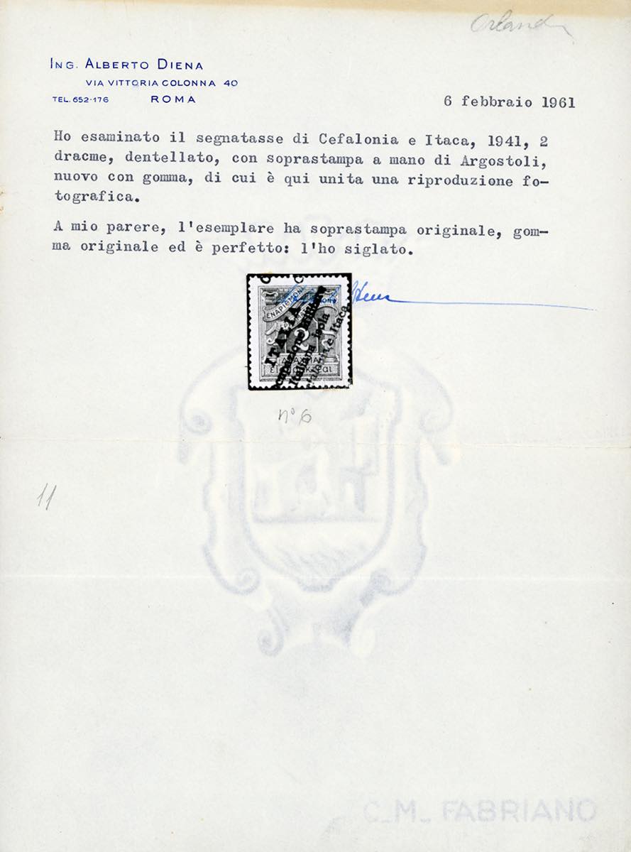 CEFALONIA E ITACA-EMISSIONI DI ARGOSTOLI SEGNATASSE 1941 - 2 d. soprastampato a mano (6), nuovo, gomma originale, leggerissima traccia di linguella, perfetto. Estremamente raro allo stato di nuovo. Cert. A.Diena. (Il Sassone non lo quota come nuovo, usato € 60.000).