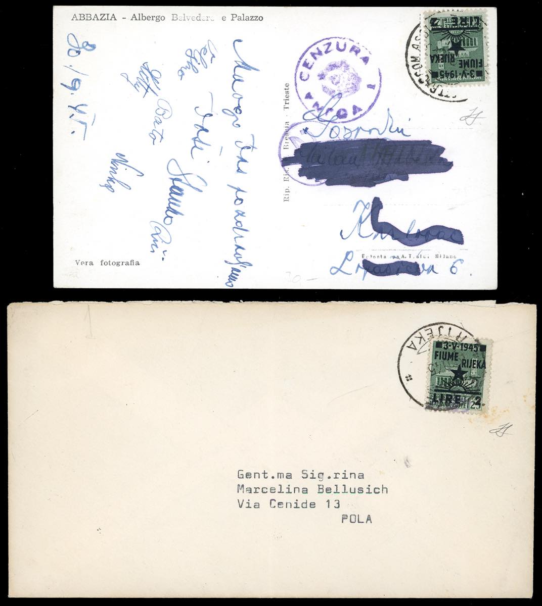OCCUPAZIONE JUGOSLAVA FIUME 1945 - 2 lire su 25 cent. (14), un esemplare su cartolina da Abbazia (?), l'altro su busta da Fiume 19/10/1945 per Pola, entrambi i francobolli perfetti. Ferrario.