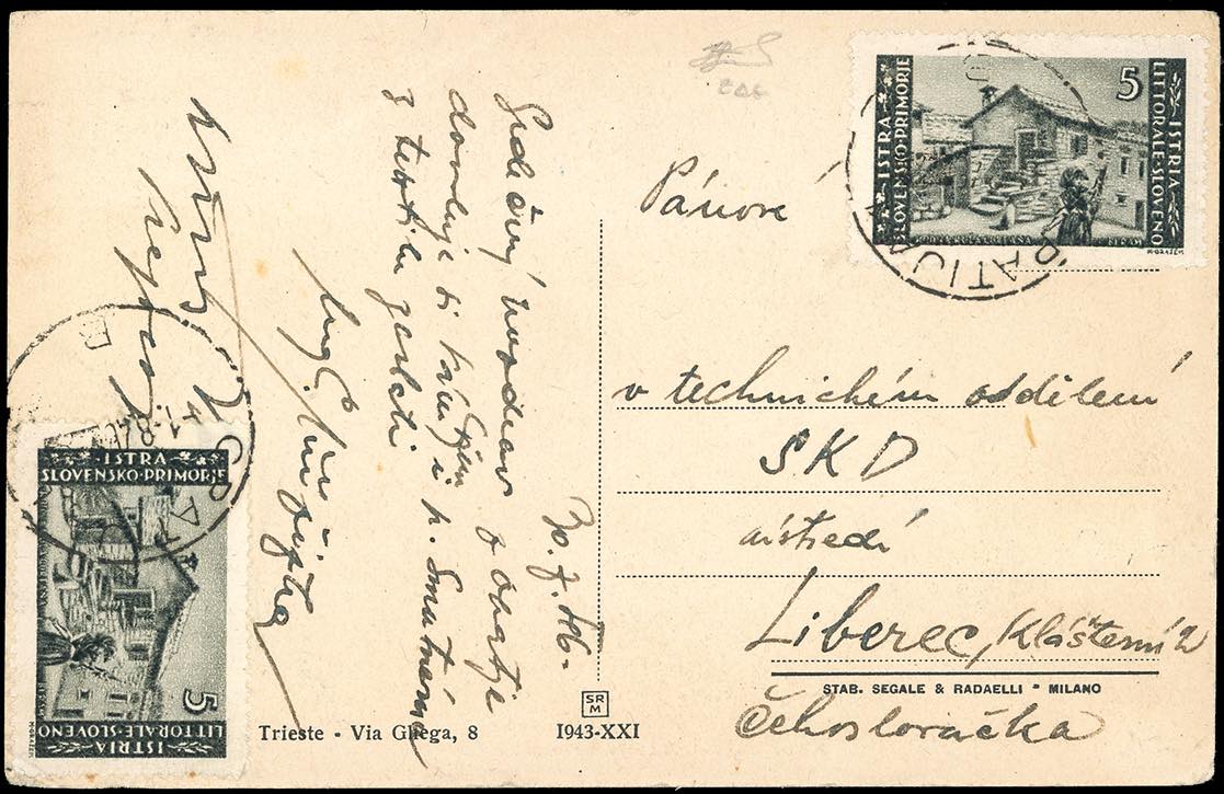 OCCUPAZIONE JUGOSLAVA ISTRIA E LITORALE SLOVENO 1946 - 5 lire, tiratura di Zagabria (57), due esemplari, perfetti, su cartolina da Abbazia 1/8/1946 a Liberec, Repubblica Cecoslovacca. Ferrario.