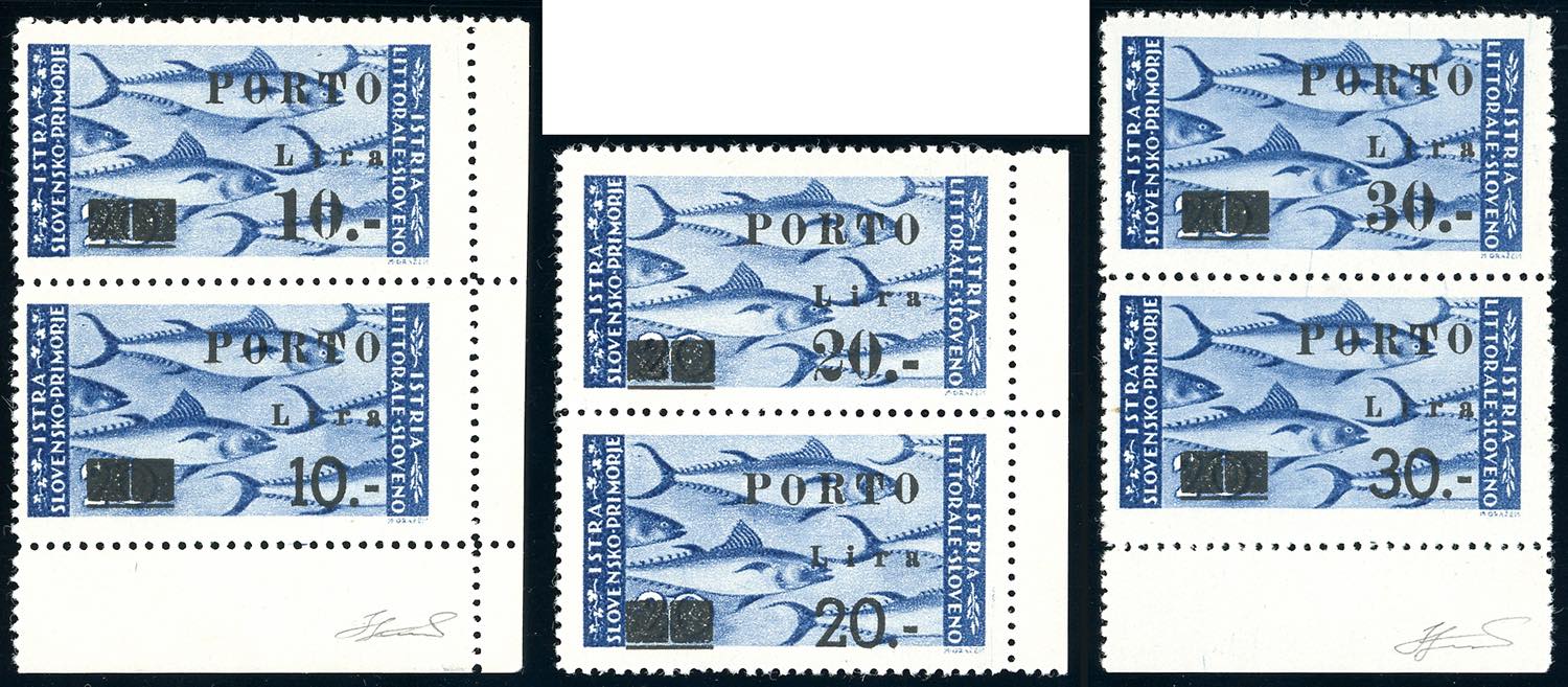 OCCUPAZIONE JUGOSLAVA ISTRIA E LITORALE SLOVENO SEGNATASSE 1946 - 10 lire su 20 lire, 20 su 20 lire, 30 su 20 lire Cifre Sottili, tutti in coppia con l'esemplare normale (17B+17,18B+18, 19B+19), bordo di foglio, gomma integra, perfette. Molto rare. Cert. Cilio e Ferrario.