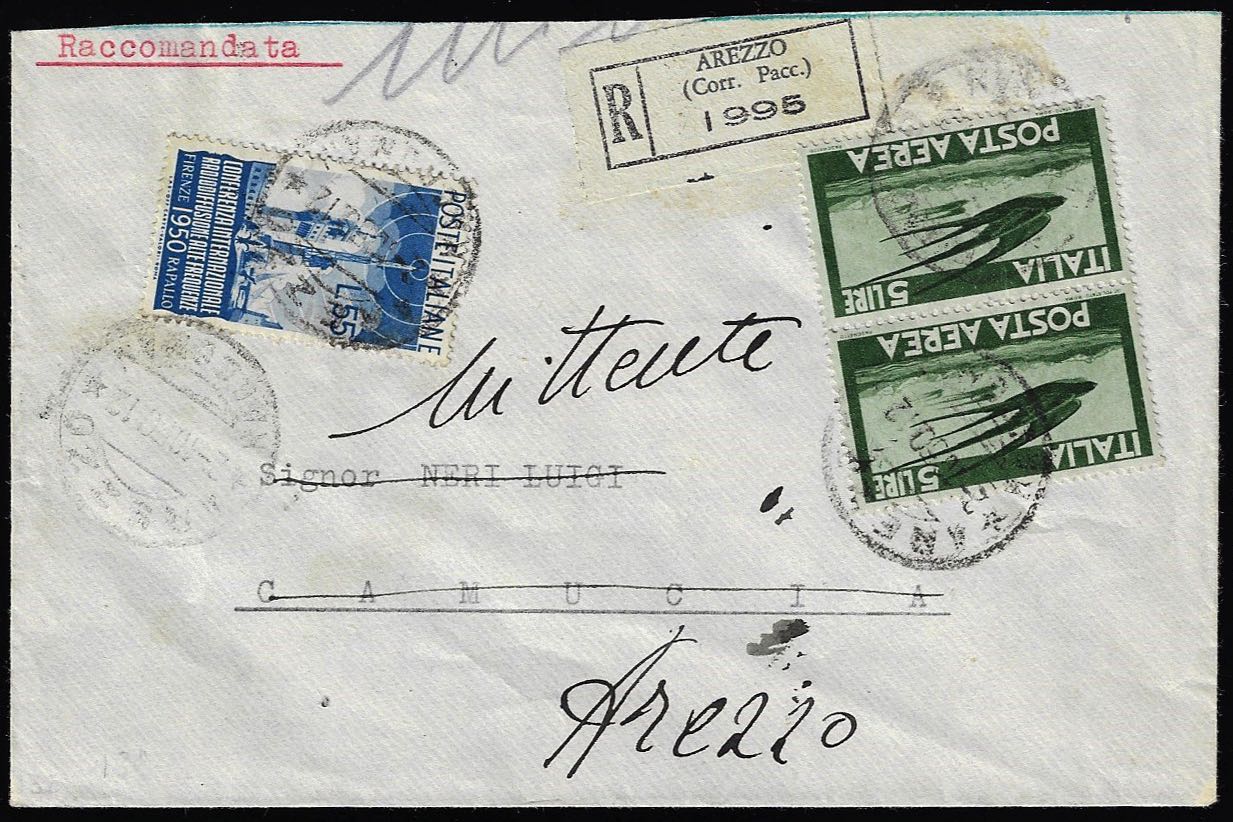 1950 - 55 lire Radiodiffusione, 5 lire Democratica posta aerea (624,A129), perfetti, su busta raccomandata da Arezzo 2/10/1950 a Camucia, rispedita al mittente.