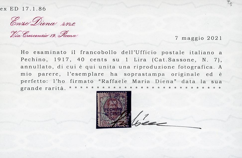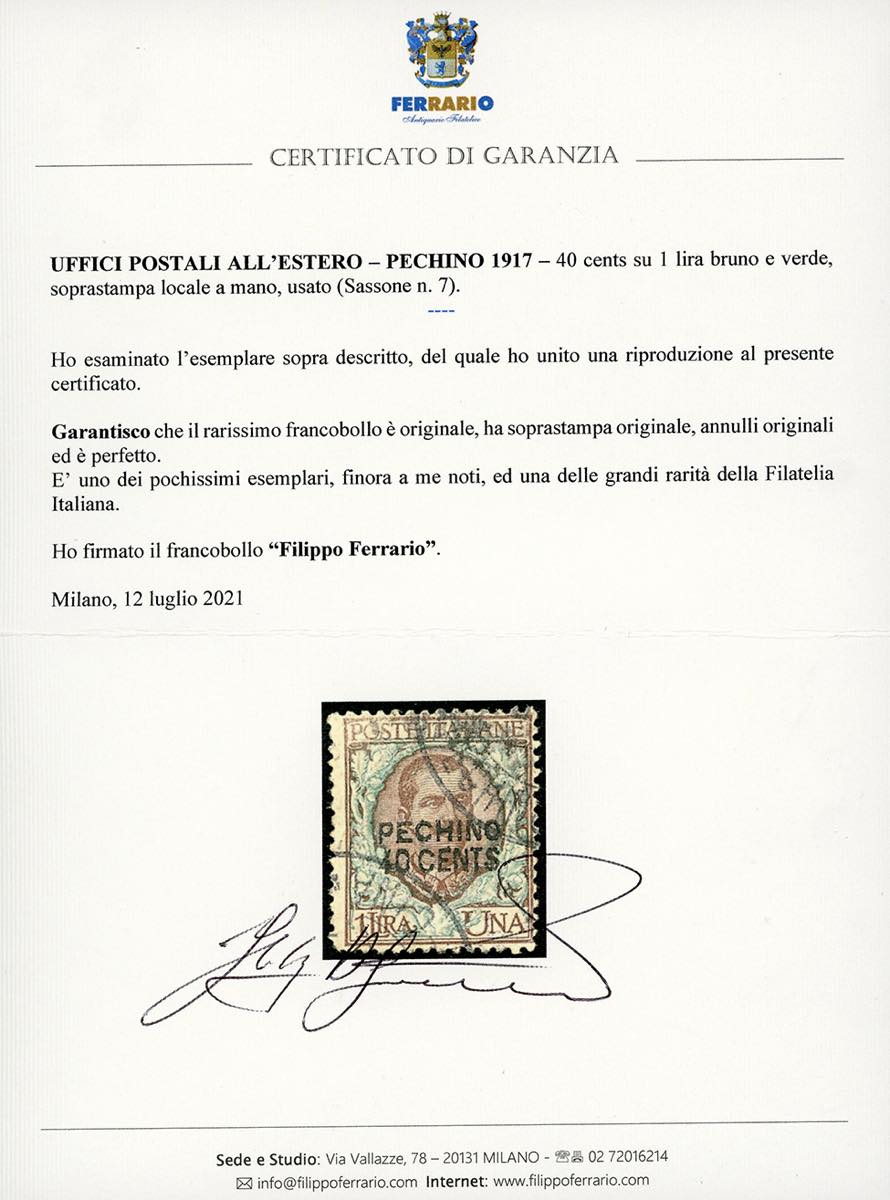 PECHINO 1917 - 40 cent. su 1 lira soprastampa a mano (7), usato, con il solo annullo di Pechino, perfetto. Grande rarità della Filatelia Italiana, uno dei pochi esemplari noti. E.Diena, Raybaudi, Caffaz, cert. Diena e Ferrario.