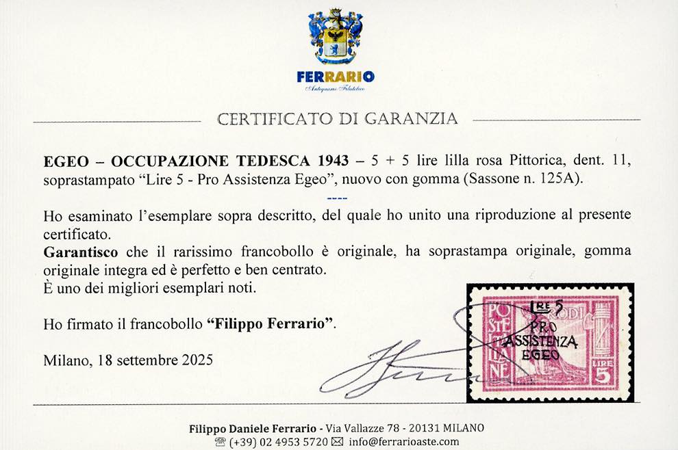 OCCUPAZIONE TEDESCA EGEO 1943 - 5 + 5 lire Pro Assistenza Egeo, dent. 11 (125A), nuovo, gomma originale integra, perfetto, uno dei pochi privo delle consuete abrasioni. Eccezionale rarità delle Colonie, dei soli 20 esemplari noti è "probabilmente il più fresco e ben centrato", come da cert. Oro Raybaudi. Giulio Bolaffi (per esteso), G.Oliva, cert. Enzo Diena e Ferrario.