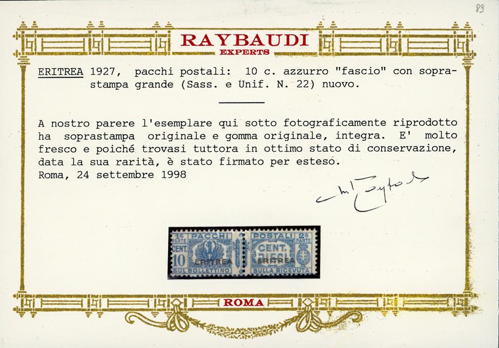 PACCHI POSTALI 1937 - 10 cent. fascio al centro soprastampato (22), gomma originale integra, perfetto e molto fresco. Raro. G.Oliva, cert. ... Leggi tutto