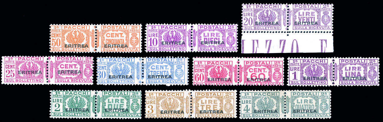 PACCHI POSTALI 1927/37 - Fascio al centro soprastampati, serietta di 10 valori (23/32), gomma originale integra, perfetti e di ottima qualità.