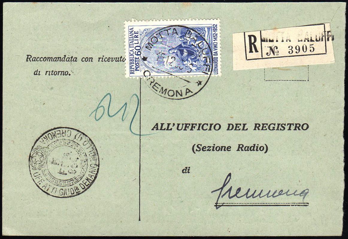 1953 - 60 lire Leonardo (687), perfetto, isolato su cartolina raccomandata da Motta Baluffi 15/12/1953 a Cremona. Non comune uso isolato.