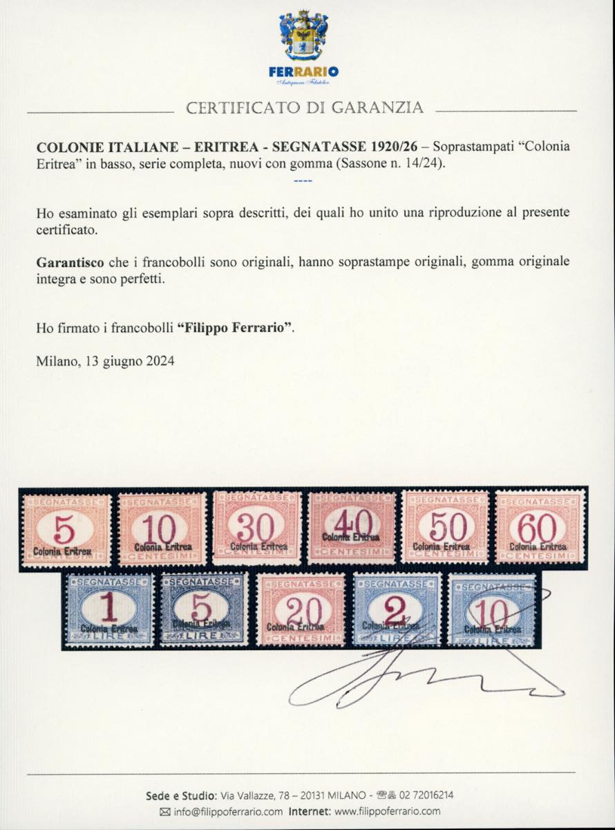 SEGNATASSE 1920/26 - Soprastampati in basso, serie completa (14/24), nuovi, gomma originale integra, perfetti. Molto freschi, non comuni. Cert. Ferrario.