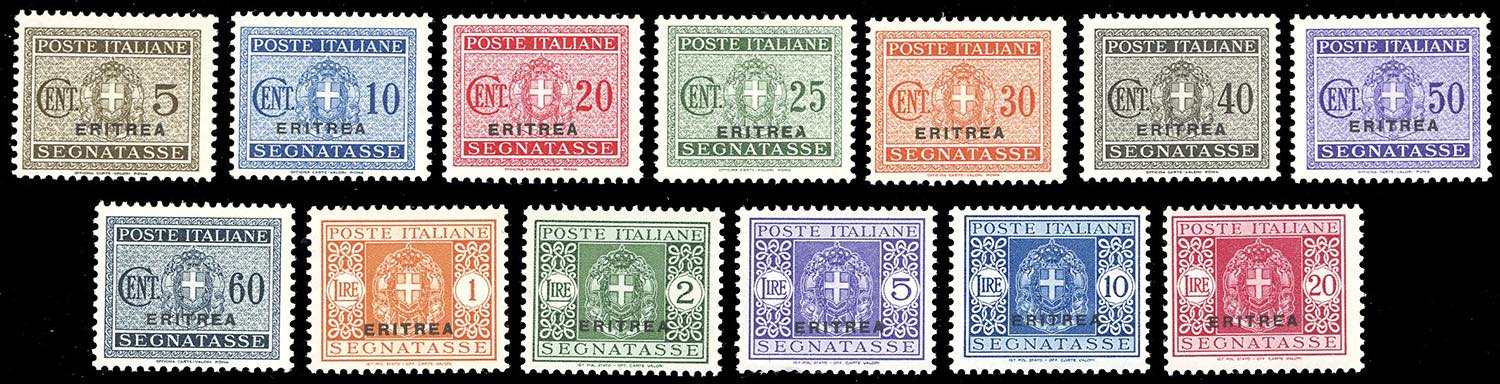 SEGNATASSE 1934 - Soprastampati, serie completa (26/38), nuovi, gomma originale integra, perfetti. Alti valori Ferrario.
