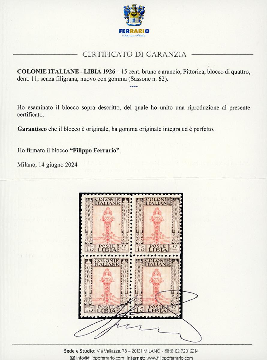 1926 - 15 cent. Pittorica, dent. 11, senza filigrana (62), blocco di quattro, gomma originale integra, perfetto e molto fresco. Raro. Cert. ... Leggi tutto