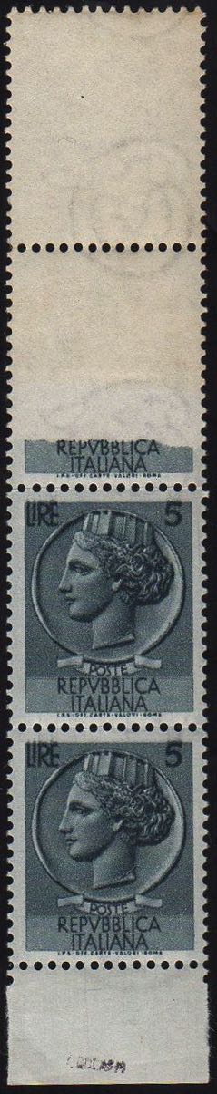 1953 - 5 lire Siracusana, filigrana ruota, striscia verticale di tre, un esemplare con stampa totalmente mancante, uno con stampa ... Leggi tutto