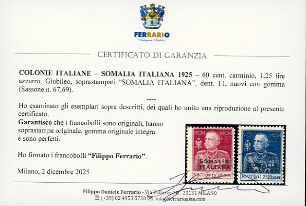 1925/26 - Giubileo, dent. 11, serie completa (67/69), nuovi, gomma originale integra, perfetti. G.Oliva per il n. 69, cert. Ferrario per la serie.
