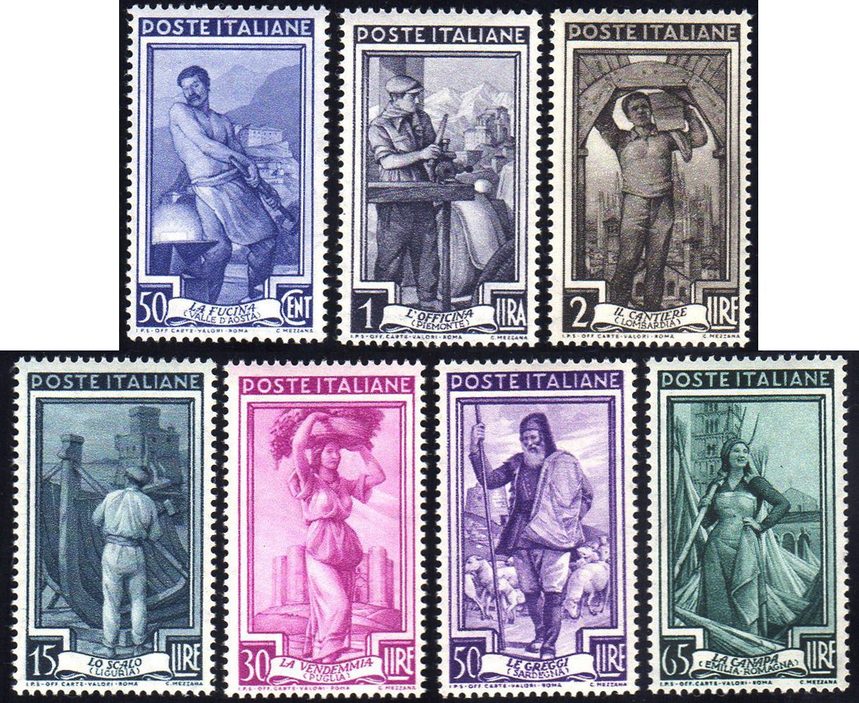 1955/57 - Lavoro, filigrana stelle (754/760), gomma integra, perfetti.