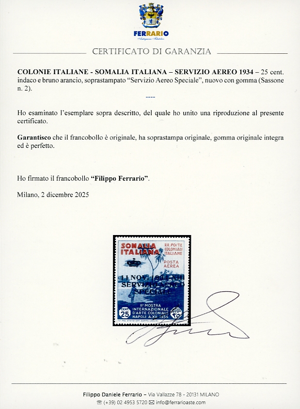 SERVIZIO AEREO 1934 - 25 cent. soprastampato "Servizio Aereo Speciale" (2), nuovo, gomma originale integra, perfetto. Cert. Ferrario.