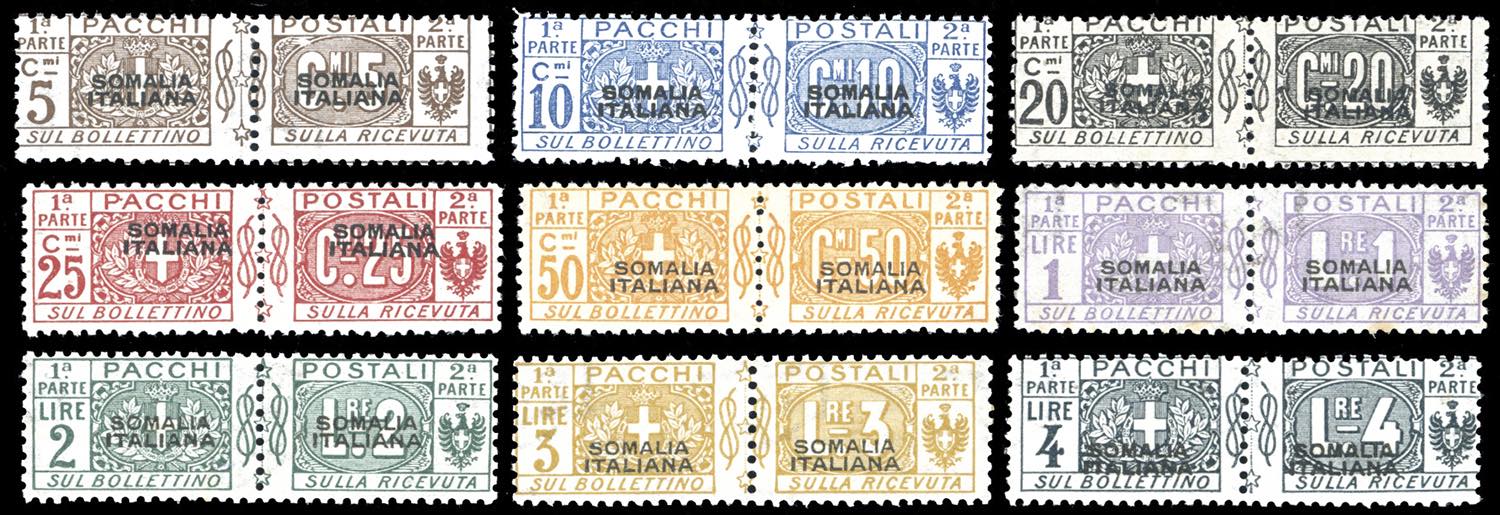 PACCHI POSTALI 1917/19 - Soprastampati "Somalia Italiana", I tipo, serie completa (1/9), gomma originale integra, perfetti. Cert. Ferrario.