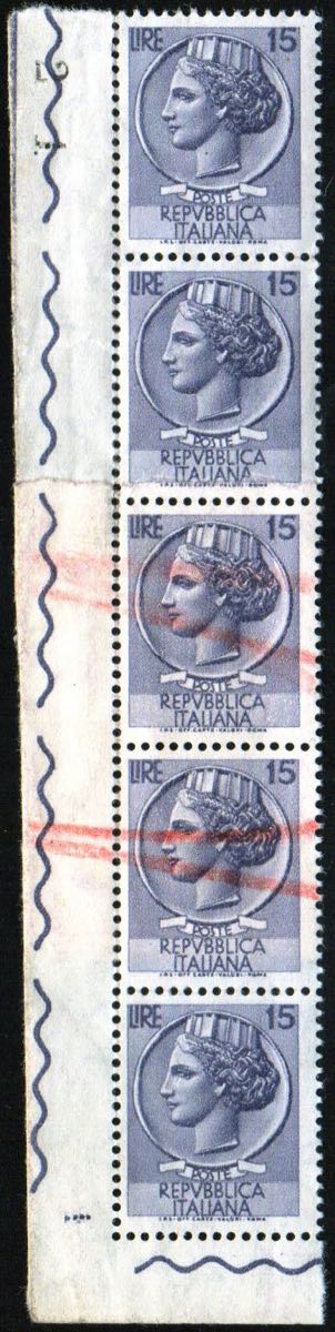 1955 - 15 lire Siracusana, filigrana stelle II tipo, striscia verticale di cinque, tre esemplari stampati su carta ricongiunta (767/Ih), ... Leggi tutto