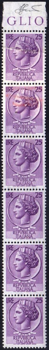 Lotto 1594 - 1955 - 25 lire Siracusana, striscia verticale di sei, i ...