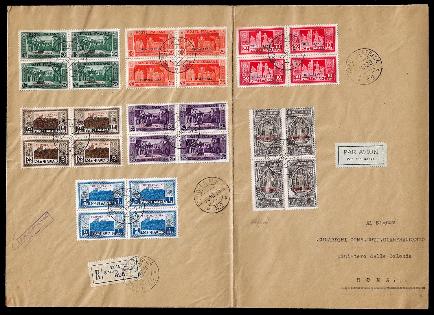 1929 - Montecassino, serie completa (54/60), blocchi di quattro, perfetti, su busta raccomandata per via aerea da Tripoli d'Africa ... Leggi tutto