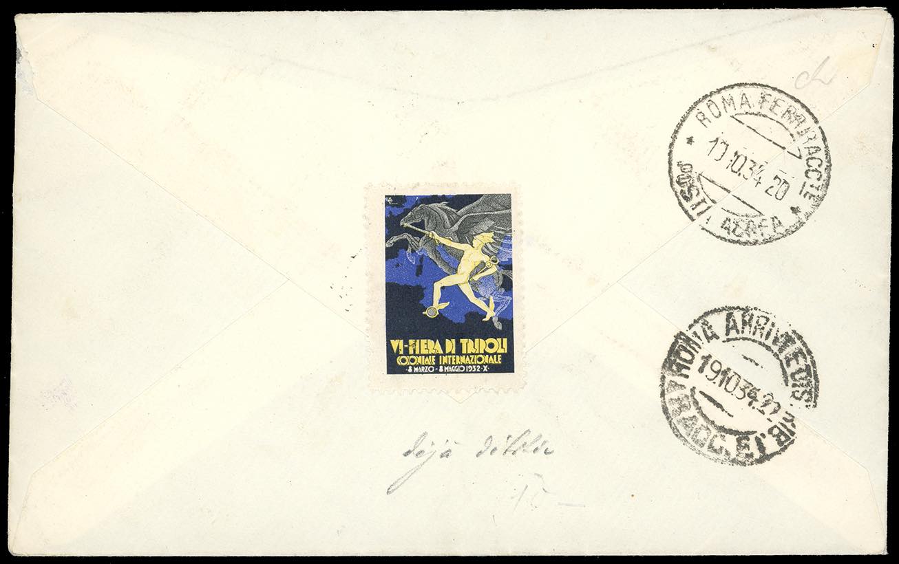 POSTA AEREA 1934 - 25 cent. e 2 lire Mostra Arte Coloniale (A41,A46), perfetti, su aerogramma raccomandato del 15/10/1934 da Tripoli a Roma, bollo d'arrivo. Questa lettera ANTICIPA DI UN GIORNO la data di emissione. Rara. Ferrario.