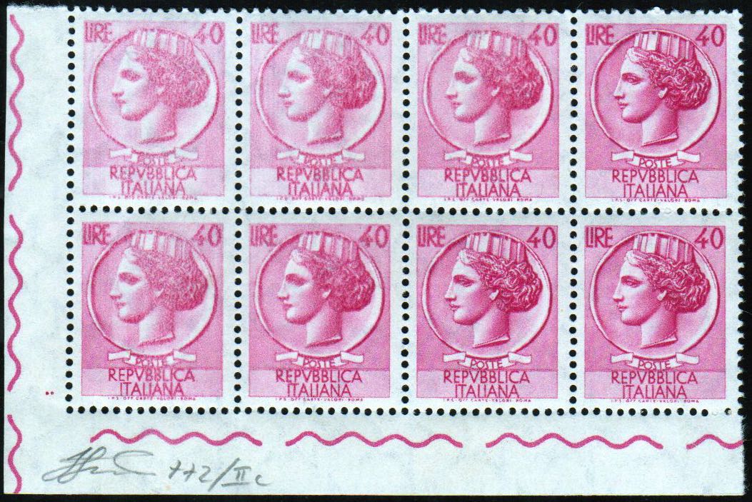 1955 - 40 lire Siracusana, filigrana stelle IV tipo, blocco di otto, cinque esemplari con stampa evanescente (772/IIc), angolo di foglio, gomma integra, perfetto.