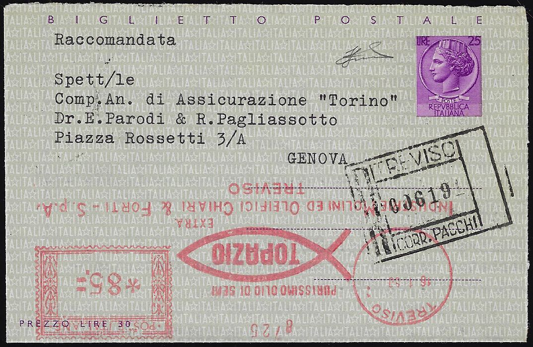 1960 - 25 lire Siracusana, biglietto postale (B45), integrato con impronta di affrancatrice meccanica privata da 85 lire, spedito per raccomandata da Treviso 16/1/1960 a Genova. Non comune questo tipo di integrazione. Ferrario.