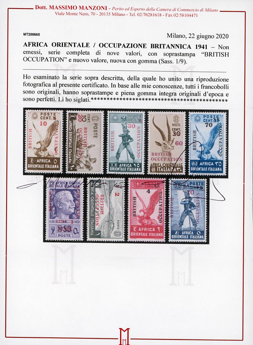 OCCUPAZIONE BRITANNICA AFRICA ORIENTALE 1941 - Soprastampati "BRITISH OCCUPATION", non emessi, serie completa (1/9), gomma originale integra, perfetti. Cert. Manzoni.