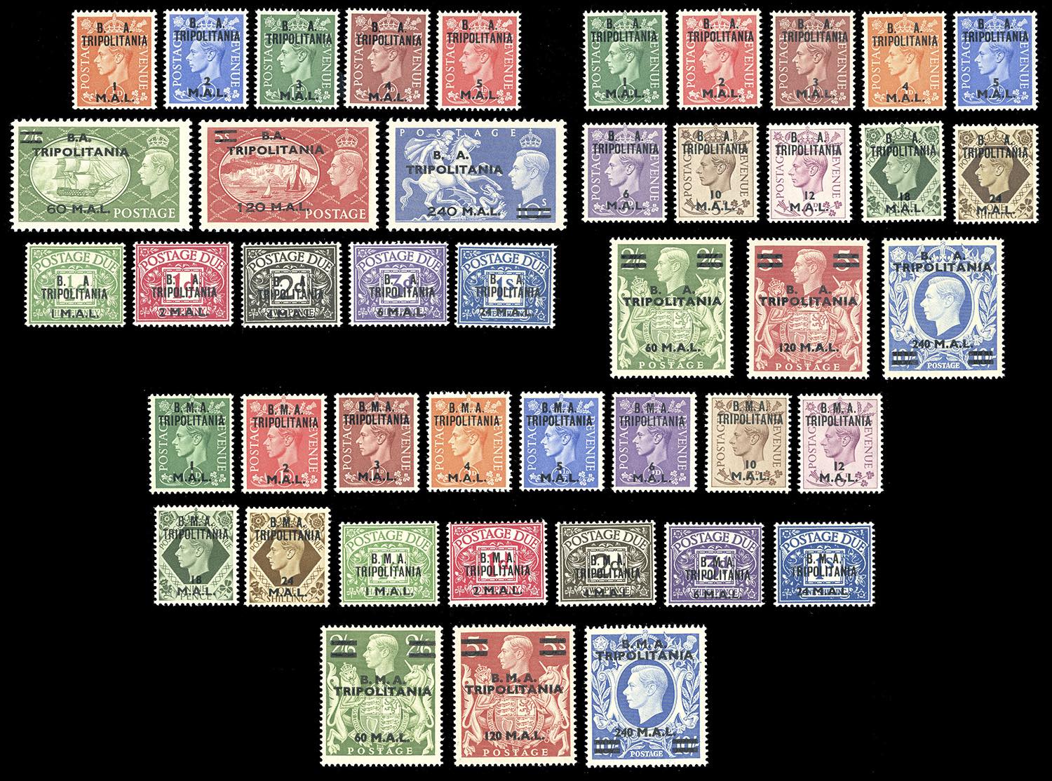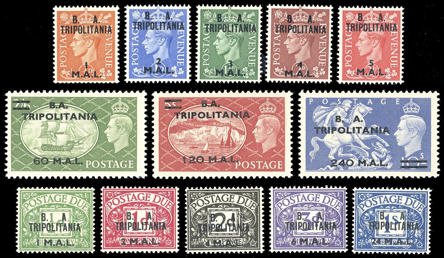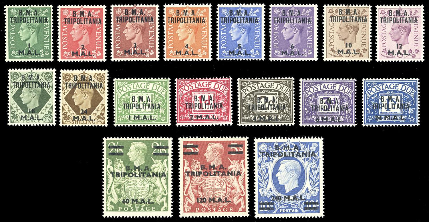 OCCUPAZIONE BRITANNICA TRIPOLITANIA 1948/51 - Tutte le emissioni di posta ordinaria e segnatasse del periodo (1/13,14/26,27/34,T1/T5,T6/T10), nuovi, gomma originale integra, perfetti.
