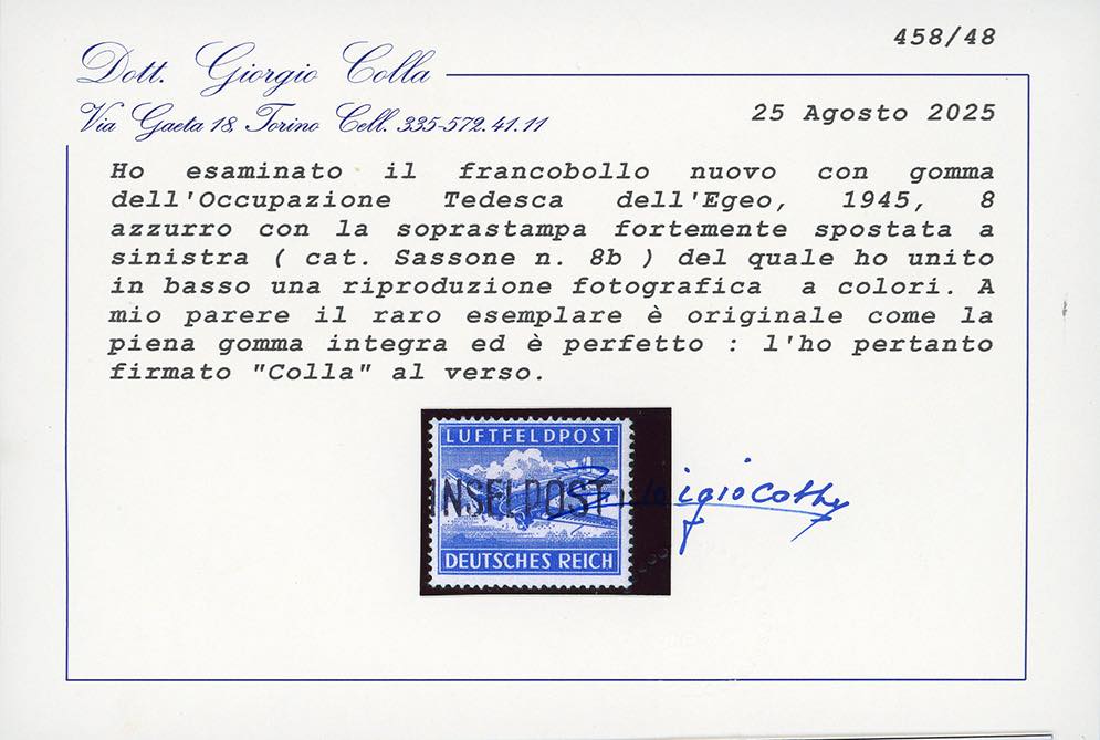 OCCUPAZIONE TEDESCA EGEO 1945 - Emissione di Leros, dent. 13 3/4, soprastampa "INSELPOST" fortemente spostata a sinistra (8b), nuovo, gomma originale integra, perfetto. Raro. A.Diena, cert. Colla.
