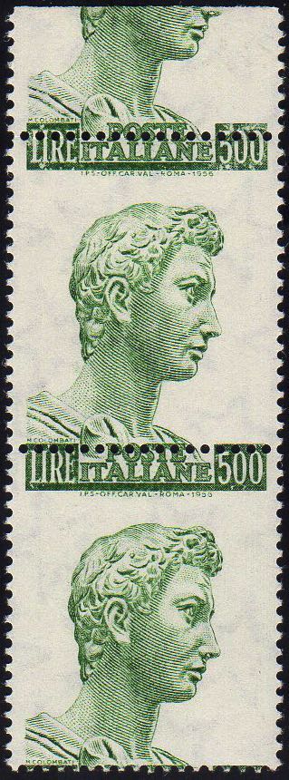 1970 - 500 lire San Giorgio, dent. 14x13 1/4, coppia verticale con dentellatura orizzontale fortemente spostata in alto (810A/Ic), nuova, gomma integra, perfetta. Ferrario.