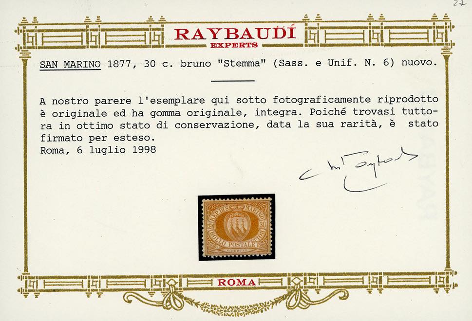 1877 - 30 cent. Stemma (6), ben centrato, nuovo, gomma originale integra, perfetto. Due cert. Oro Raybaudi.