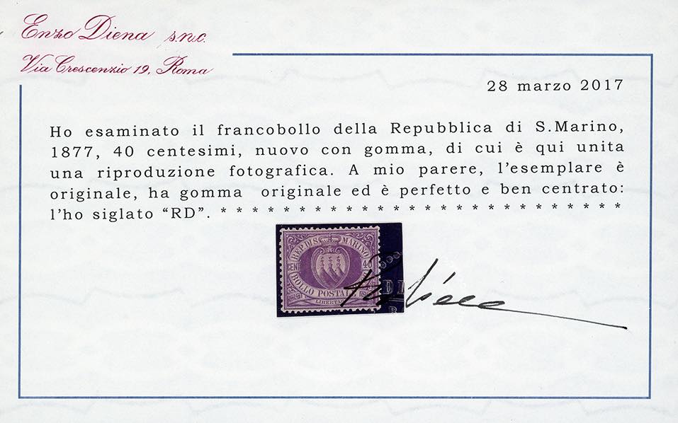 1877 - 40 cent. violetto Stemma (7), nuovo, gomma originale, linguellato, perfetto. Molto ben centrato. Cert. Diena.