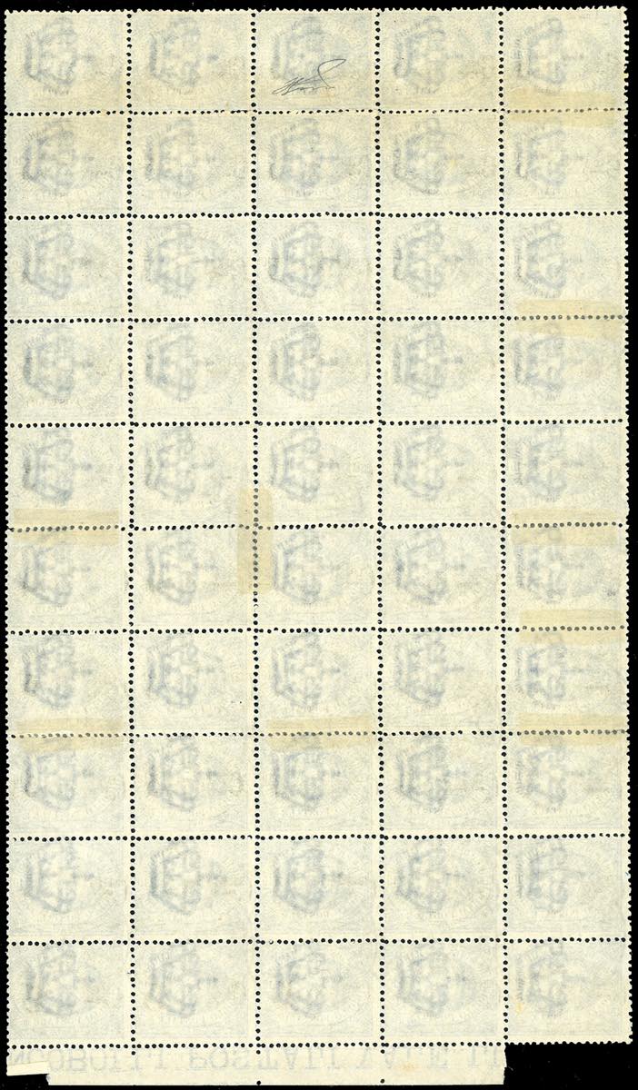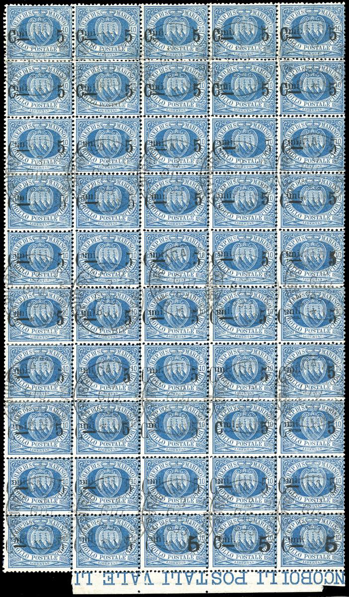 1892 - 5 cent. su 10 cent. soprastampato, foglio completo di 50 esemplari, con diverse varietà tipografiche ... Leggi tutto