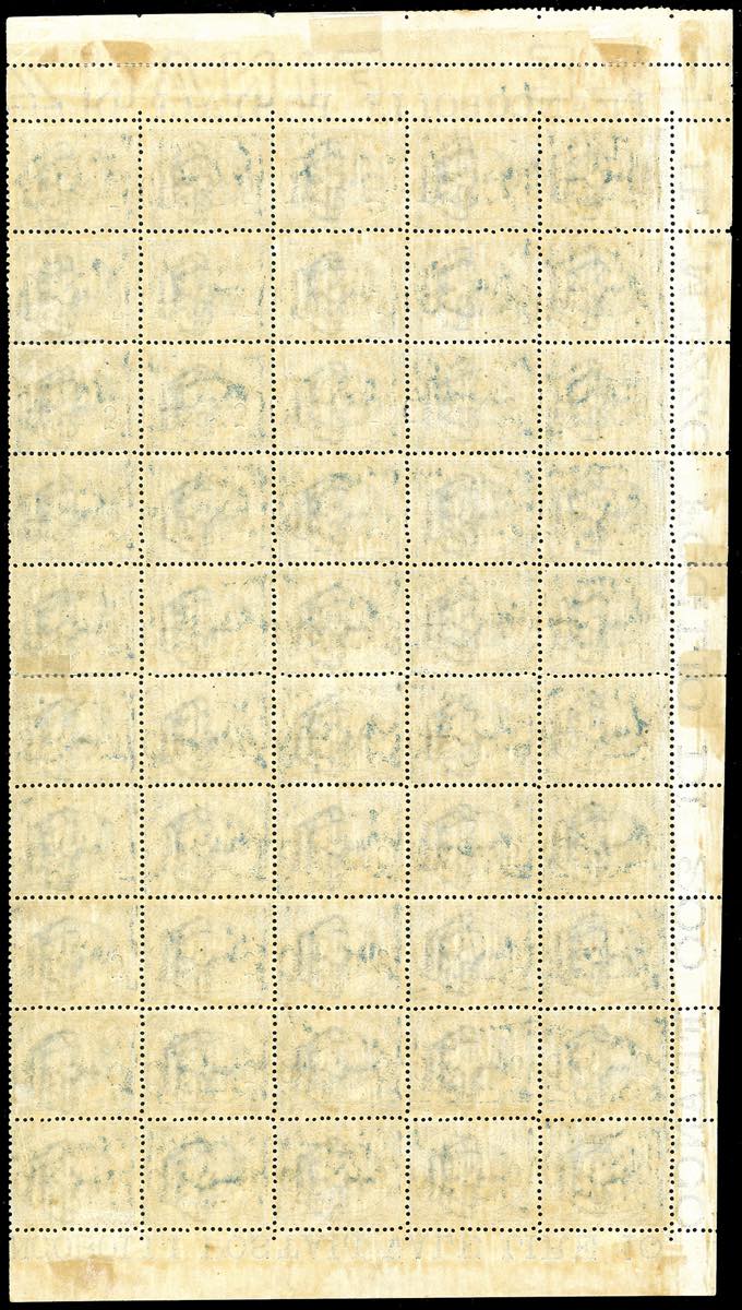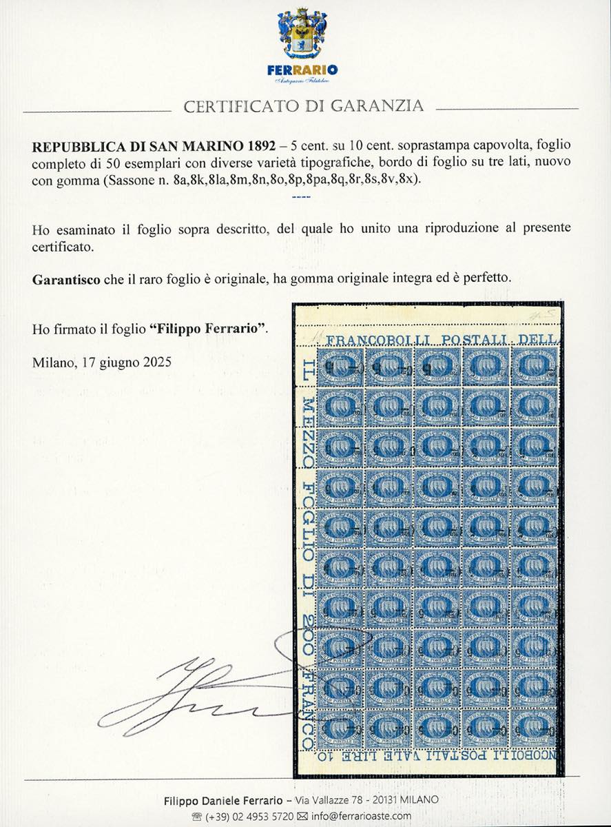1892 - 5 cent. su 10 cent., soprastampa capovolta (8a), foglio completo di 50 esemplari con diverse varietà tipografiche (8k,8la,8m,8n,8o,8p,8pa,8q,8r,8s,8v,8x), bordo di foglio su tre lati, nuovo, gomma originale integra, perfetto. Molto raro. Cert. A.Diena e Ferrario.