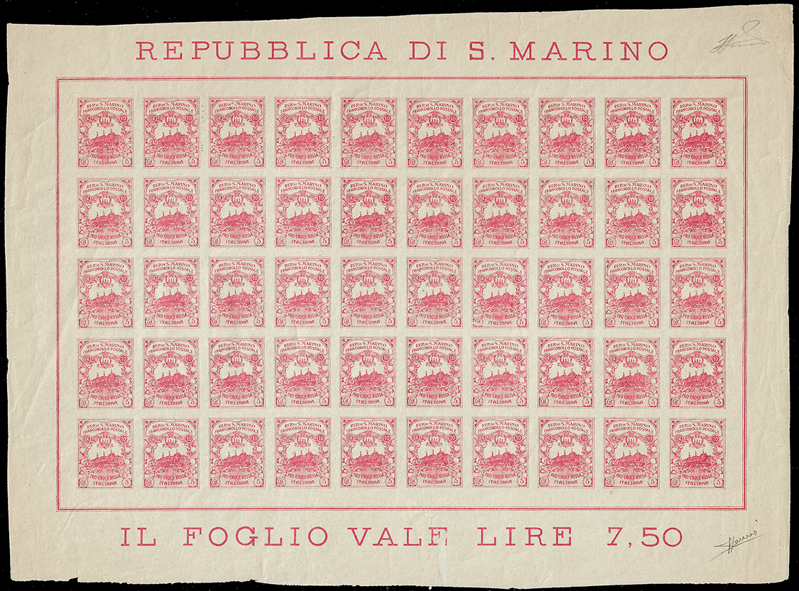 1916 - 10 + 5 cent. Croce Rossa, non emesso, non dentellato, foglio completo di 50 esemplari (CEI 50 Aa, € 63.000++), nuovo, gomma originale integra, perfetto. Estremamente raro. Sorani, cert. Ferrario.