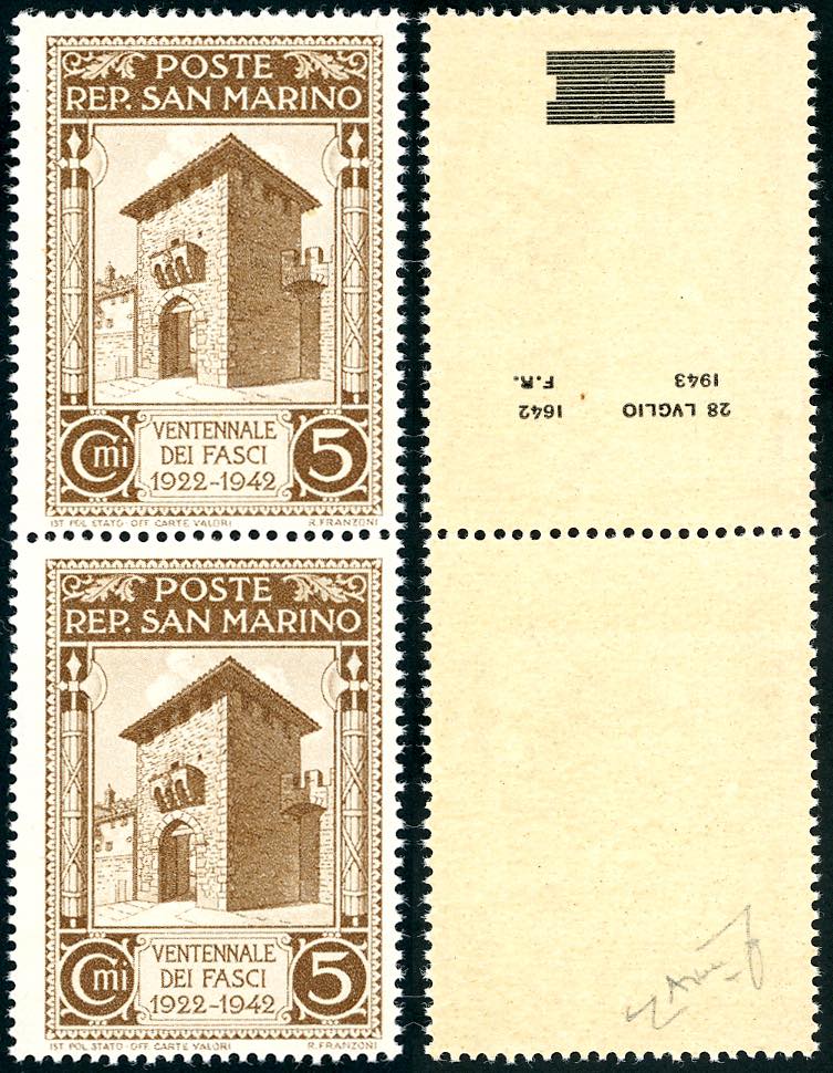 1943 - 5 cent. Caduta del fascismo, coppia verticale di cui uno senza soprastampa e uno con la soprtastampa solo al verso capovolta e di tipo diverso (253Aba), gomma integra, perfetta. Rarissima, TRE SOLI ESEMPLARI NOTI. Cert. Avanzo.
