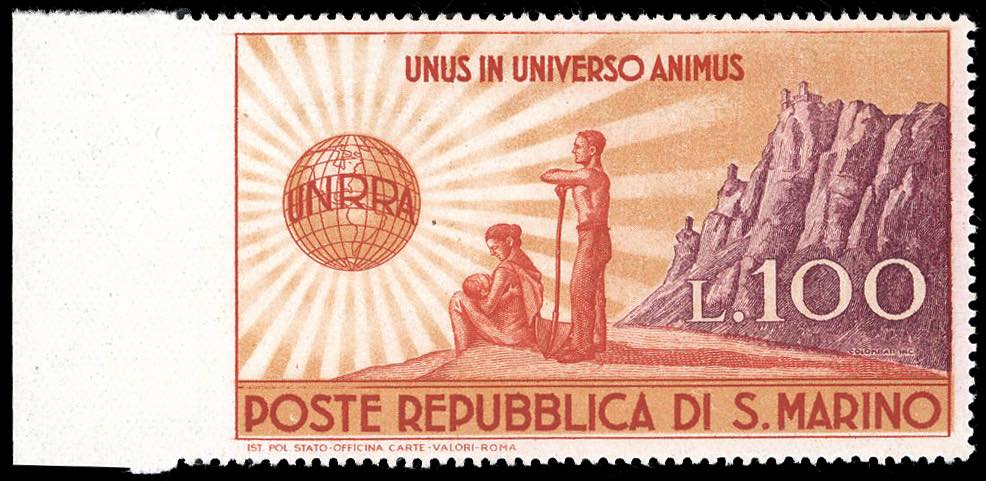 1946 - 100 lire UNRRA, non dentellato a sinistra (296b), bordo di foglio, nuovo, gomma originale integra, perfetto. Ferrario.