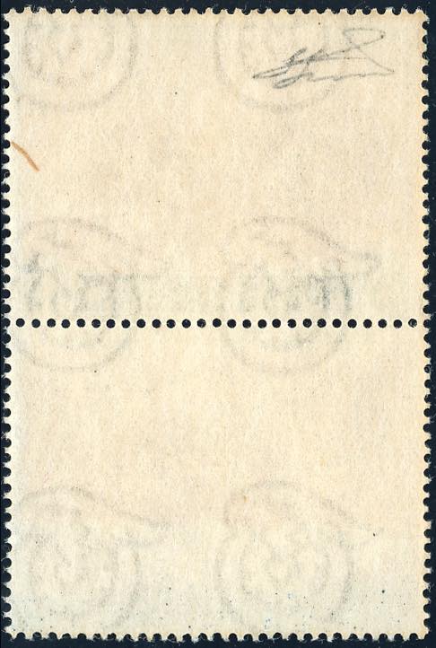 1952 - 1 lira Colombo (372i,nota), coppia verticale, l'esemplare inferiore senza la stampa del cartiglio in basso e di parte del centro, gomma originale integra, perfetto. Rarissima varietà, non catalogata. Cert. Ferrario.