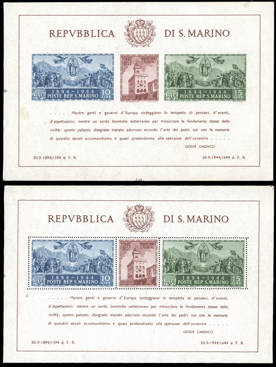 1945 - Palazzo del Governo, foglietto dentellato e non (6,7), gomma originale integra, perfetti. Ferrario.