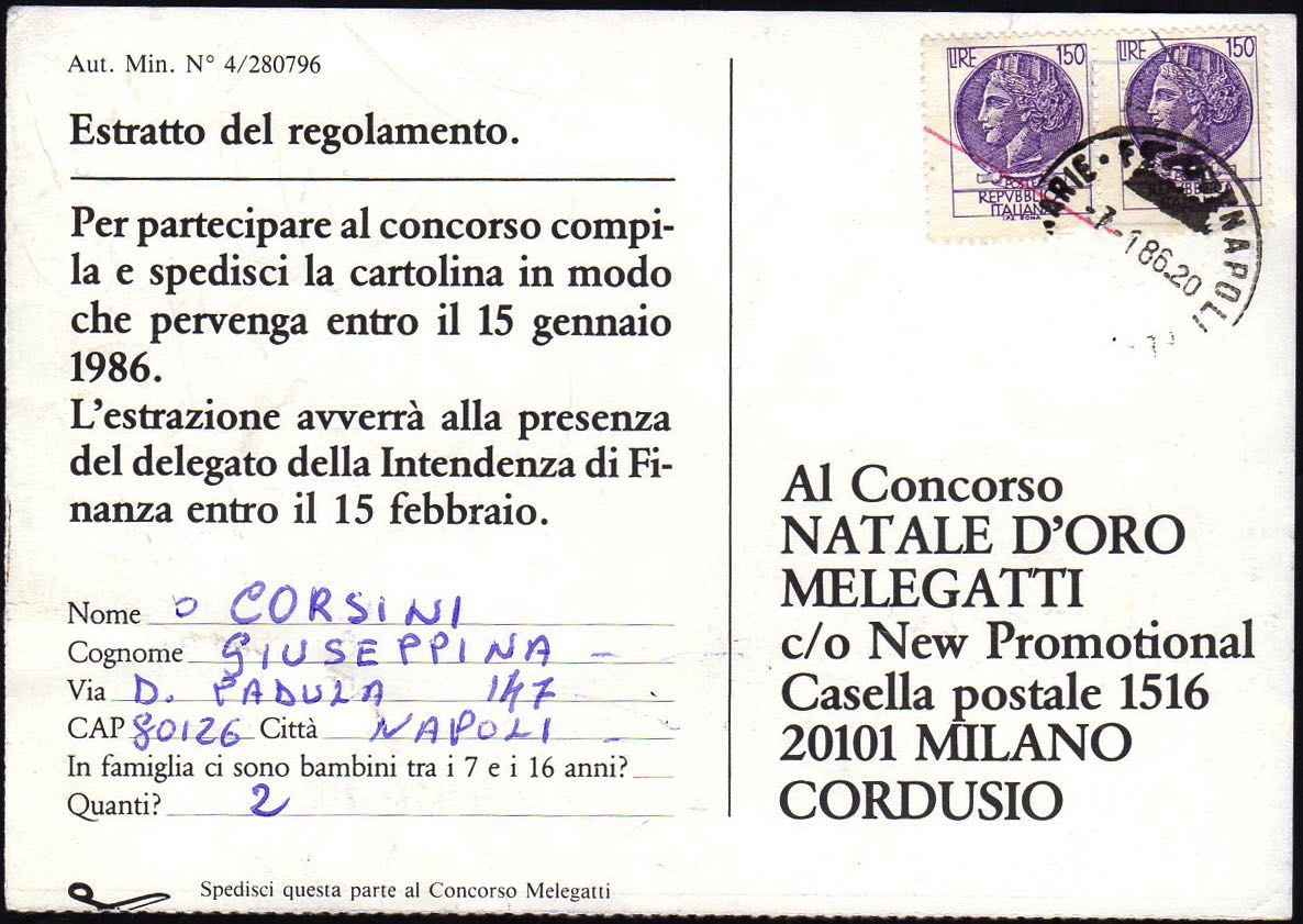 1986 - 150 lire Siracusana, falso per posta di Roma (F1083A/I), coppia con difetti di dentellatura, su catolina da Napoli 7/1/1986 per Milano.