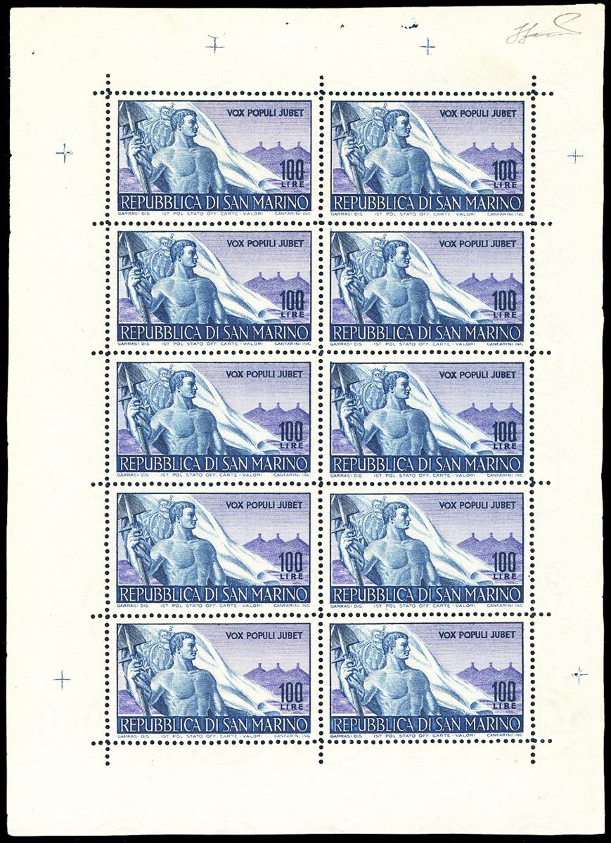 1948 - 100 lire Lavoratori, minifoglio (9), nuovo, gomma originale integra, perfetto, senza pieghe. Molto fresco. Cert. Giordani 1987 e ... Leggi tutto