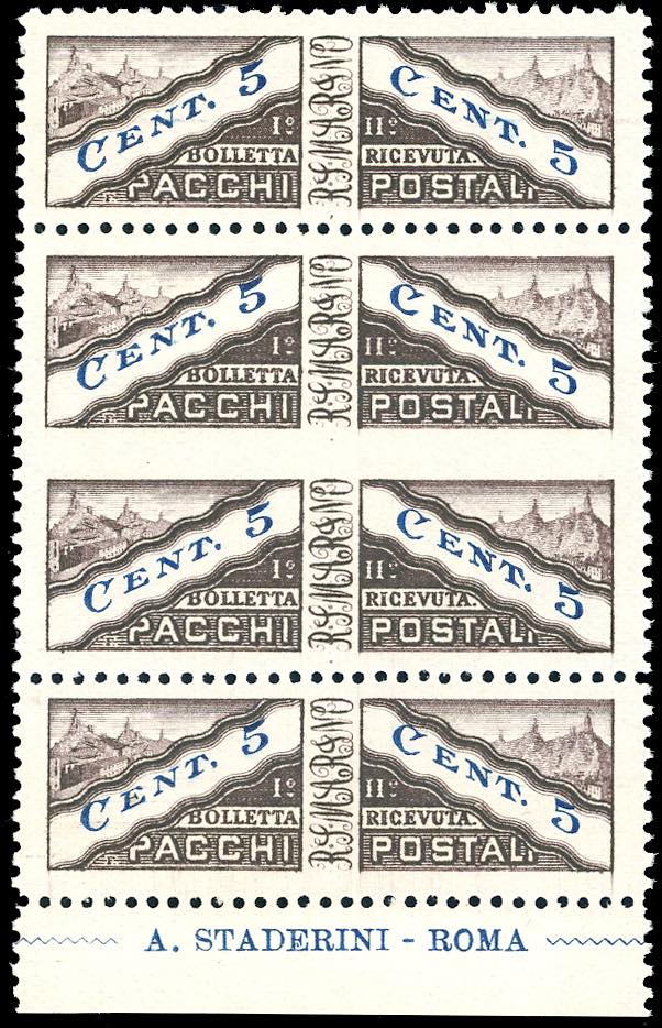 1928 - 5 cent. striscia verticale di quattro comprendente una coppia verticale non dentellata al centro (1i), decalco al verso, bordo di foglio, gomma originale integra, perfetta.